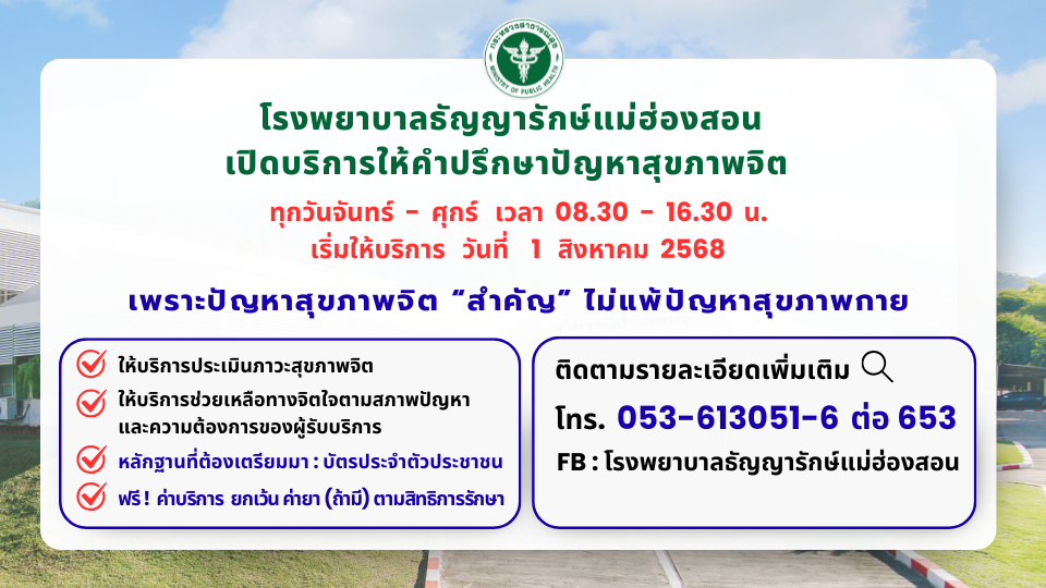 โรงพยาบาลธัญญารักษ์แม่ฮ่องสอน เปิดบริการให้คำปรึกษาปัญหาสุขภาพจิต