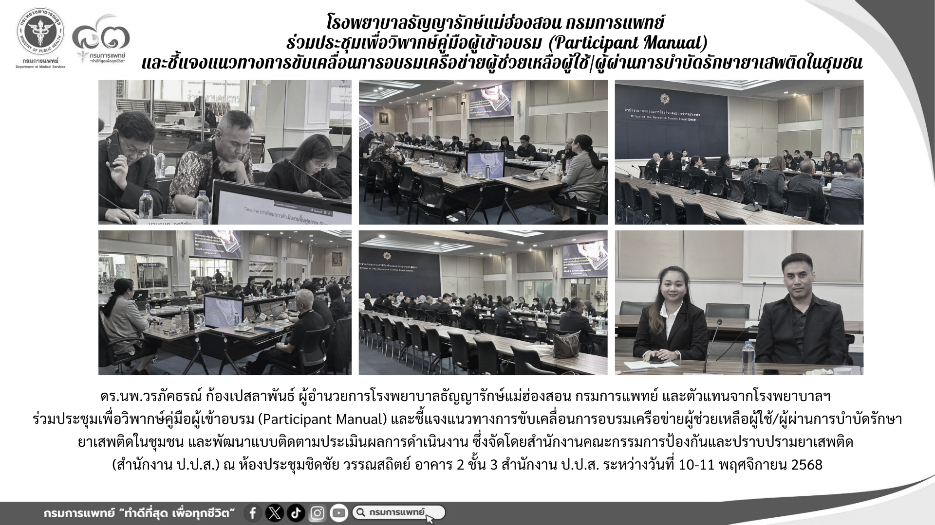 ประชุมเพื่อวิพากษ์คู่มือผู้เข้าอบรม (Participant Manual) และชี้แจงแนวทางการขับเคลื่อนการอบรมเครือข่ายผู้ช่วยเหลือผู้ใช้/ผู้ผ่านการบำบัดรักษายาเสพติดในชุมชน และพัฒนาแบบติดตามประเมินผลการดำเนินงาน โดยสำนักงานคณะกรรมการป้องกันและปราบปรามยาเสพติด (สำนักงาน ป.ป.ส.)