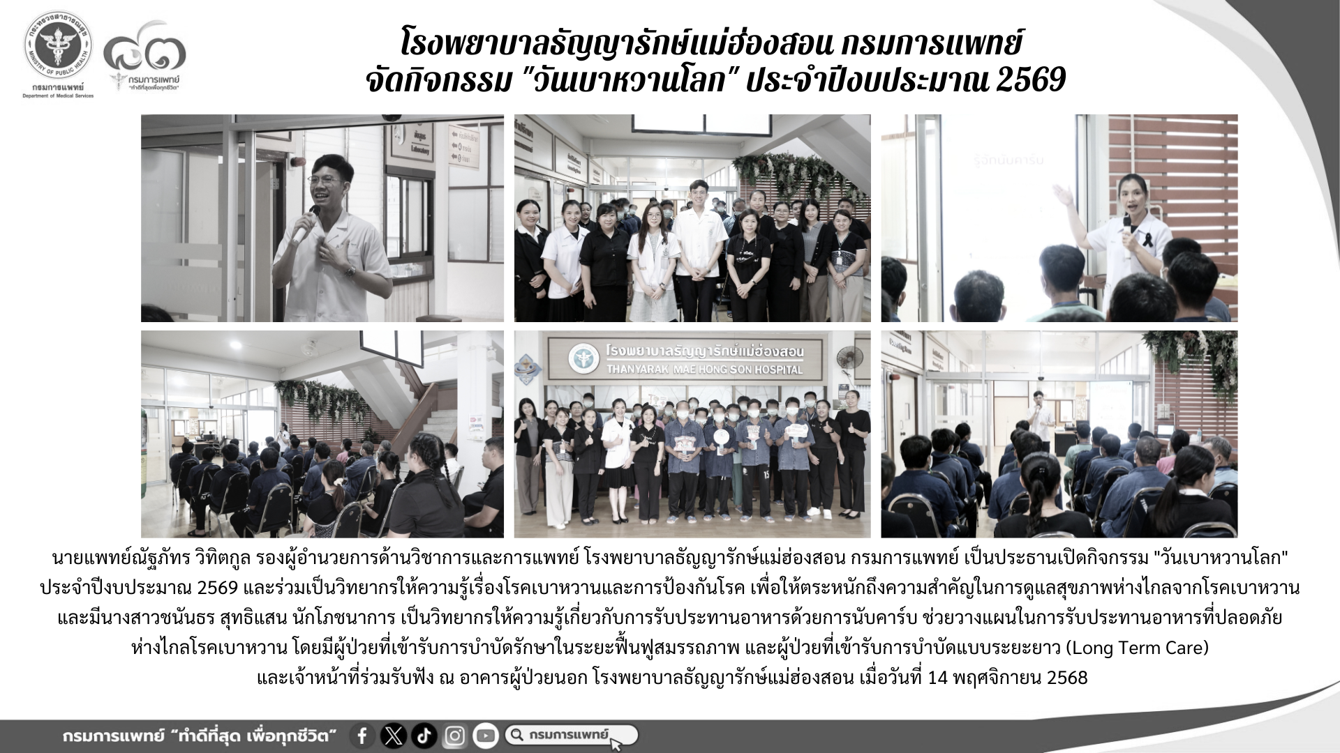 นายแพทย์ณัฐภัทร วิทิตกูล รองผู้อำนวยการด้านวิชาการและการแพทย์ เป็นประธานเปิดกิจกรรม “วันเบาหวานโลก” ประจำปีงบประมาณ 2569 และร่วมเป็นวิทยากรให้ความรู้เรื่องโรคเบาหวานและการป้องกันโรค เพื่อให้ตระหนักถึงความสำคัญในการดูแลสุขภาพห่างไกลจากโรคเบาหวาน และมีนางสาวชนันธร สุทธิแสน นักโภชนาการ เป็นวิทยากรให้ความรู้เกี่ยวกับการรับประทานอาหารด้วยการนับคาร์บ