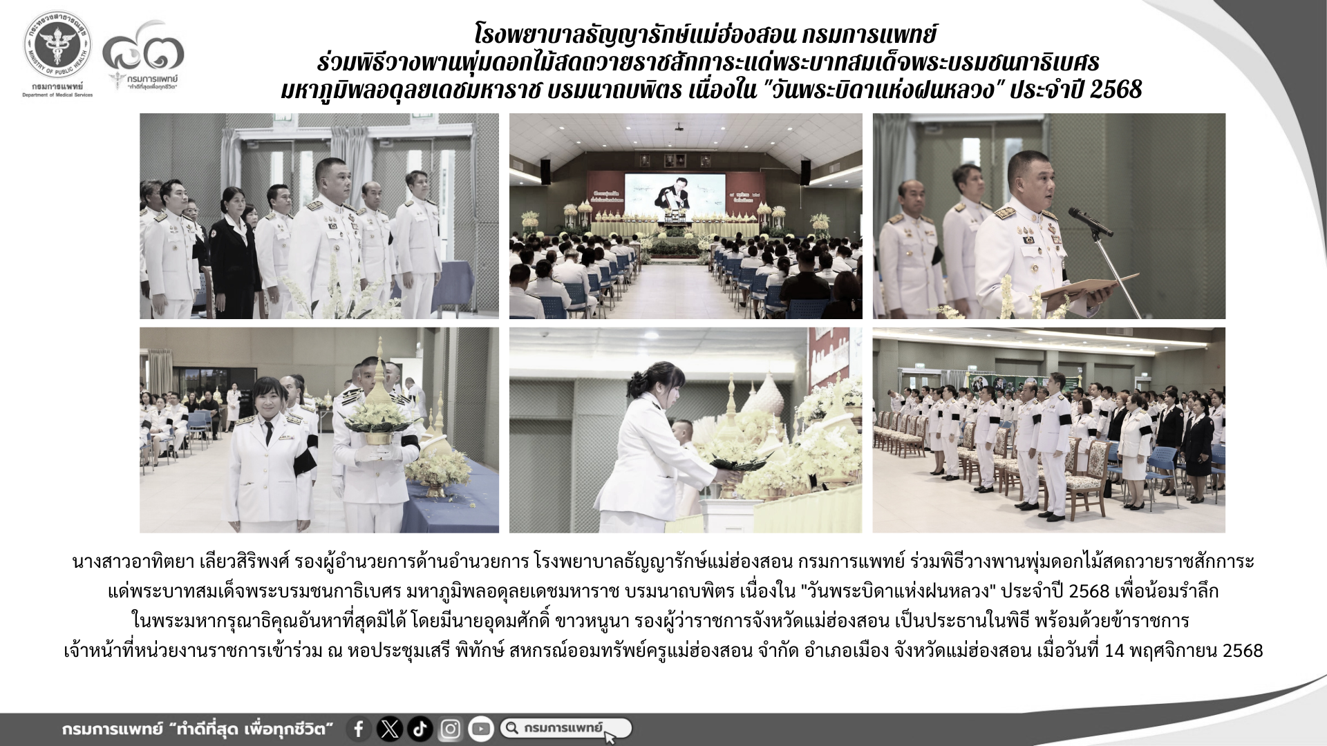 ร่วมพิธีวางพานพุ่มดอกไม้สดถวายราชสักการะแด่พระบาทสมเด็จพระบรมชนกาธิเบศร มหาภูมิพลอดุลยเดชมหาราช บรมนาถบพิตร เนื่องใน “วันพระบิดาแห่งฝนหลวง” ประจำปี 2568 เพื่อน้อมรําลึกในพระมหากรุณาธิคุณอันหาที่สุดมิได้