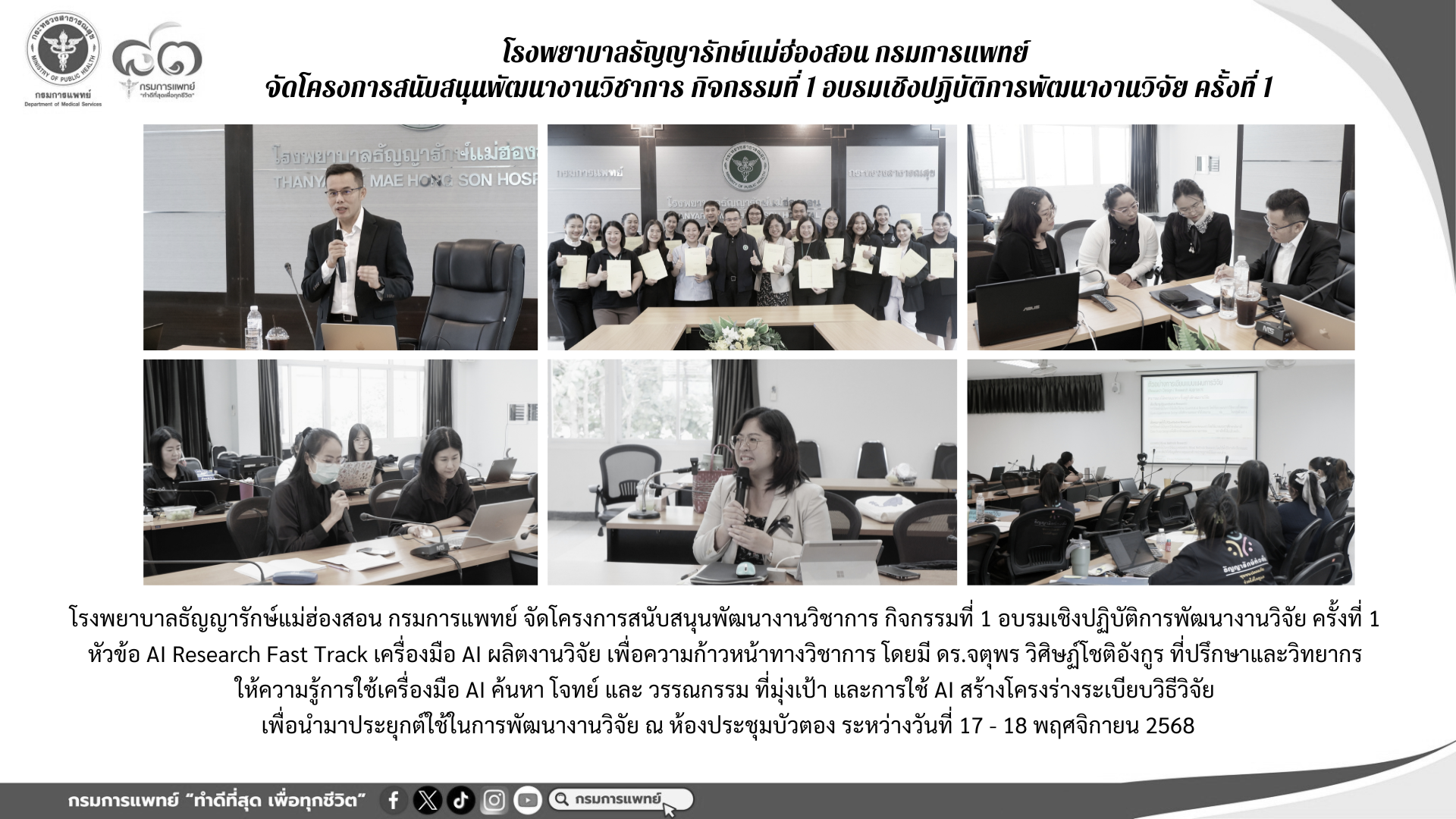 อบรมเชิงปฏิบัติการพัฒนางานวิจัย ครั้งที่ 1 หัวข้อ AI Research Fast Track เครื่องมือ AI ผลิตงานวิจัย เพื่อความก้าวหน้าทางวิชาการ โดยมี ดร.จตุพร วิศิษฏ์โชติอังกูร ที่ปรึกษาและวิทยากร ให้ความรู้การใช้เครื่องมือ AI ค้นหา โจทย์ และ วรรณกรรม ที่มุ่งเป้า และการใช้ AI สร้างโครงร่างระเบียบวิธีวิจัย เพื่อนำมาประยุกต์ใช้ในการพัฒนางานวิจัย