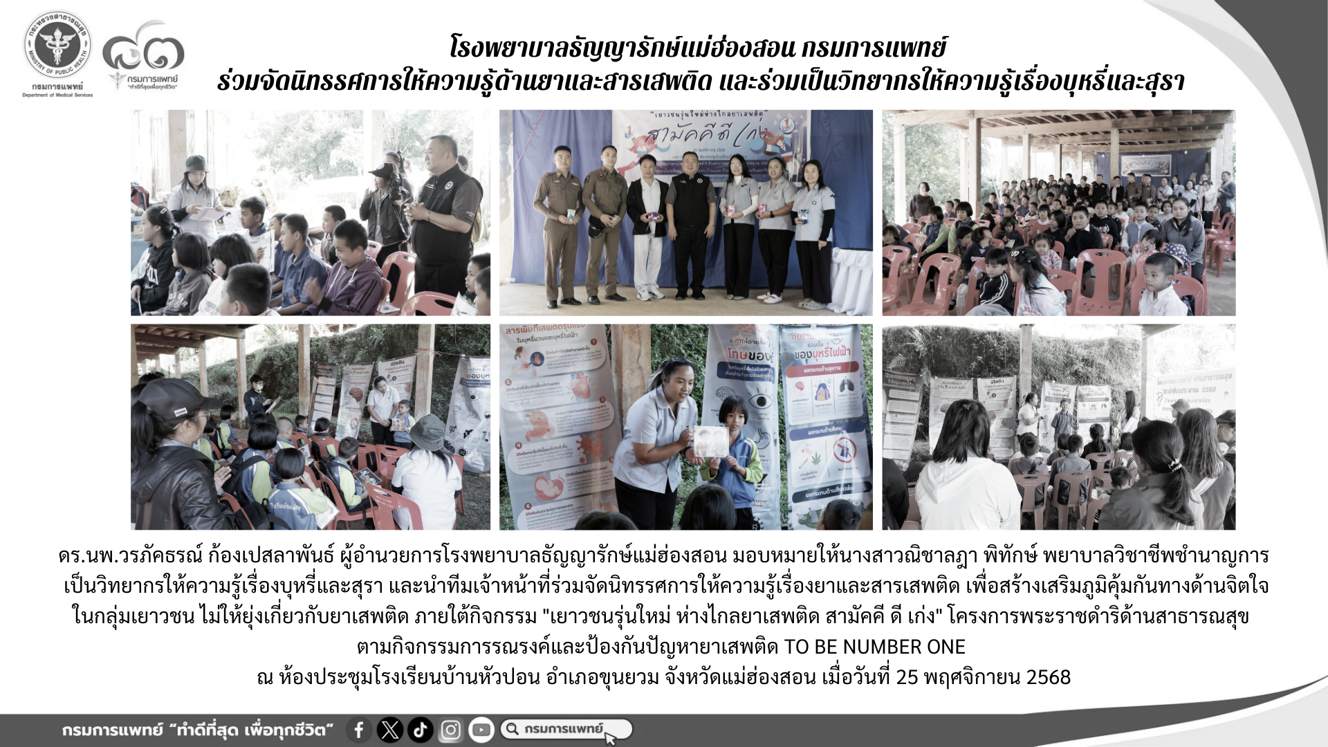 เจ้าหน้าที่ร่วมจัดนิทรรศการให้ความรู้เรื่องยาและสารเสพติด เพื่อสร้างเสริมภูมิคุ้มกันทางด้านจิตใจในกลุ่มเยาวชนไม่ให้ยุ่งเกี่ยวกับยาเสพติด ภายใต้กิจกรรม “เยาวชนรุ่นใหม่ ห่างไกลยาเสพติด สามัคคี ดี เก่ง” โครงการพระราชดำริด้านสาธารณสุข ตามกิจกรรมการรณรงค์และป้องกันปัญหายาเสพติด TO BE NUMBER ONE