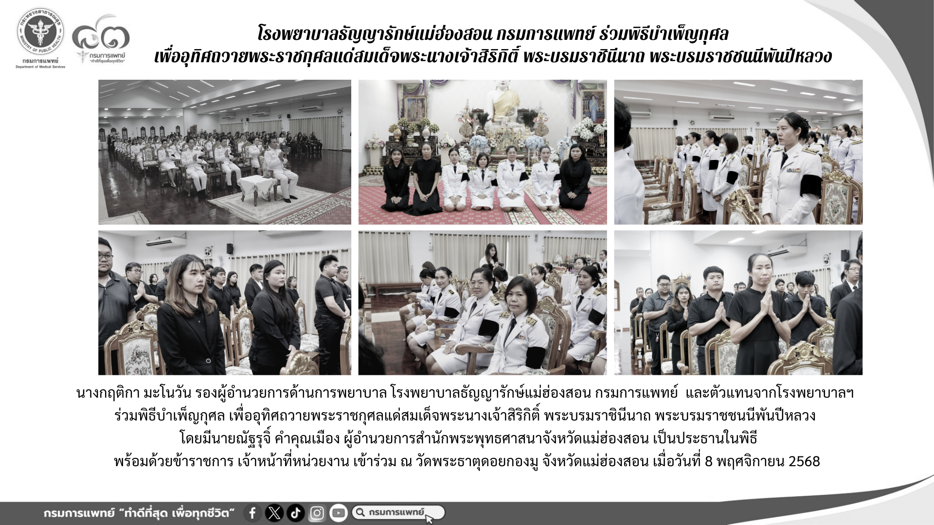 ร่วมพิธีบำเพ็ญกุศล เพื่ออุทิศถวายพระราชกุศลแด่สมเด็จพระนางเจ้าสิริกิติ์ พระบรมราชินีนาถ พระบรมราชชนนีพันปีหลวง โดยมีนายณัฐรุจิ์ คำคุณเมือง ผู้อำนวยการสำนักพระพุทธศาสนาจังหวัดแม่ฮ่องสอน เป็นประธานในพิธี พร้อมด้วยข้าราชการ เจ้าหน้าที่หน่วยงาน เข้าร่วม