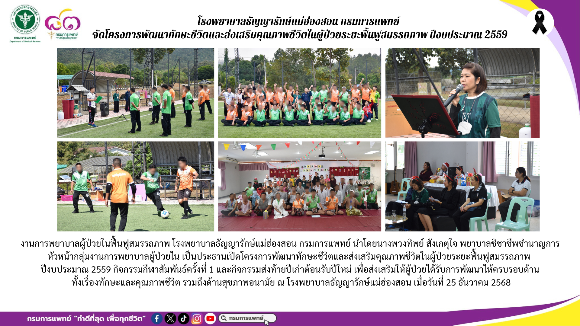 โครงการพัฒนาทักษะชีวิตและส่งเสริมคุณภาพชีวิตในผู้ป่วยระยะฟื้นฟูสมรรถภาพ ปีงบประมาณ 2569 กิจกรรมกีฬาสัมพันธ์ครั้งที่ 1 และกิจกรรมส่งท้ายปีเก่าต้อนรับปีใหม่ เพื่อส่งเสริมให้ผู้ป่วยได้รับการพัฒนาให้ครบรอบด้าน ทั้งเรื่องทักษะและคุณภาพชีวิต รวมถึงด้านสุขภาพอนามัย
