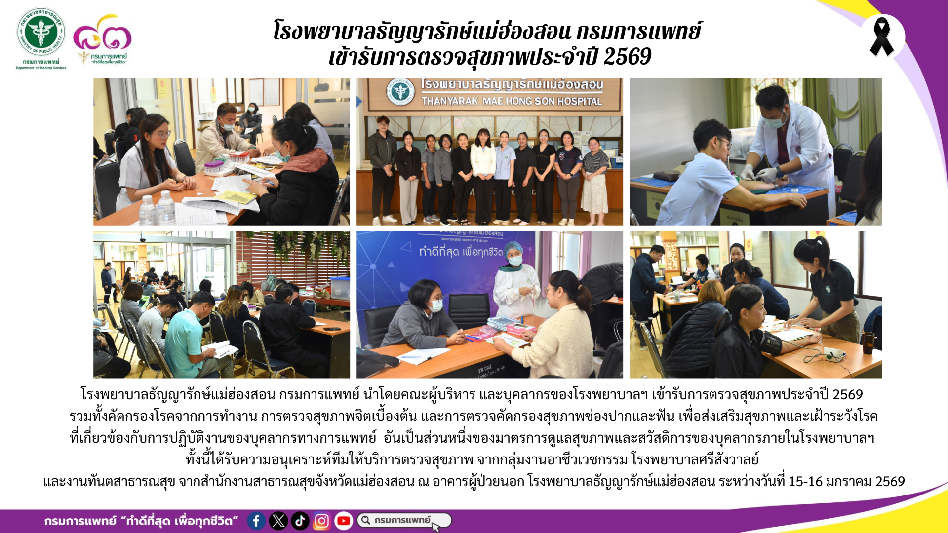 การตรวจสุขภาพประจำปี 2569 รวมทั้งคัดกรองโรคจากการทำงาน การตรวจสุขภาพจิตเบื้องต้น และการตรวจคัดกรองสุขภาพช่องปากและฟัน เพื่อส่งเสริมสุขภาพและเฝ้าระวังโรคที่เกี่ยวข้องกับการปฏิบัติงานของบุคลากรทางการแพทย์