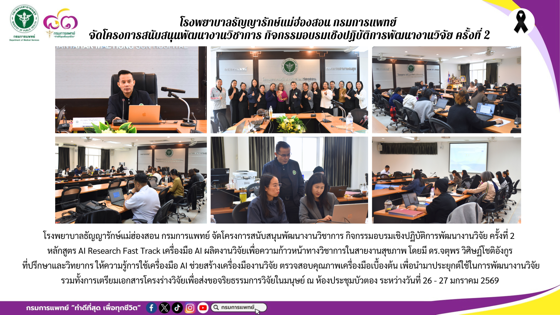 หลักสูตร AI Research Fast Track เครื่องมือ AI ผลิตงานวิจัยเพื่อความก้าวหน้าทางวิชาการในสายงานสุขภาพ โดยมี ดร.จตุพร วิศิษฏ์โชติอังกูร ที่ปรึกษาและวิทยากร ให้ความรู้การใช้เครื่องมือ AI ช่วยสร้างเครื่องมืองานวิจัย ตรวจสอบคุณภาพเครื่องมือเบื้องต้น เพื่อนำมาประยุกต์ใช้ในการพัฒนางานวิจัย รวมทั้งการเตรียมเอกสารโครงร่างวิจัยเพื่อส่งขอจริยธรรมการวิจัยในมนุษย์