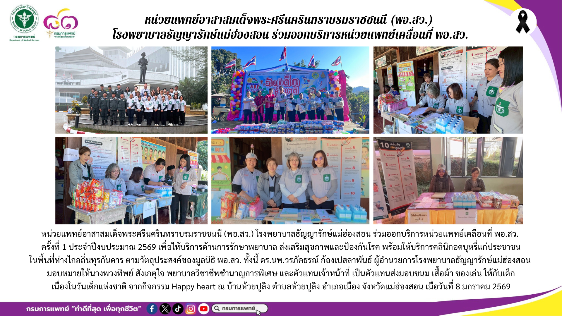 ร่วมออกบริการหน่วยแพทย์เคลื่อนที่ พอ.สว. ครั้งที่ 1 ประจำปีงบประมาณ 2569 เพื่อให้บริการด้านการรักษาพยาบาล ส่งเสริมสุขภาพและป้องกันโรค พร้อมให้บริการคลินิกอดบุหรี่แก่ประชาชนในพื้นที่ห่างไกลถิ่นทุรกันดาร ตามวัตถุประสงค์ของมูลนิธิ พอ.สว.
